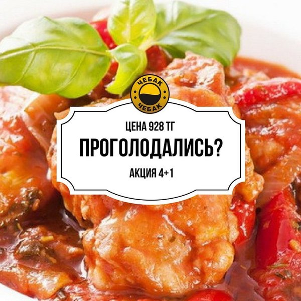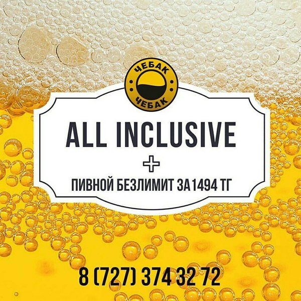 Добрый день, дорогие наши! Напоминаем Вам, что каждое воскресенье в Чебаке действует Пивной Безлимит Заплати 1494 и выпей сколько сможешь А также действуют обсалютно все ежедневные акции! Наш адрес: ул. Толе би 216 В, уг. ул. Розыбакиева. Резерв столиков: 374-32-72.