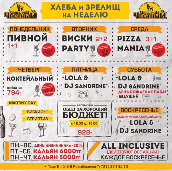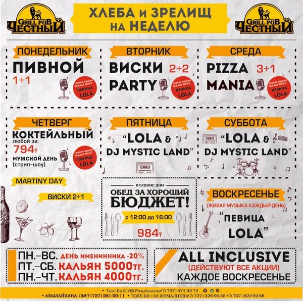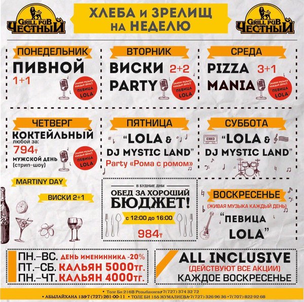 Добрый день, друзья! Желаем Вам вкусной и сытной недели вместе с Честным! Приятная музыка, уютная атмосфера и вкусная еда, что еще нужно для того что бы собраться в хорошей компании и поболтать по душам, а может быть и порешать важные дела, решать вам! В ЧЕСТНОМ обед за хороший бюджет 346 86 98 / WhatsApp ул.им.Толе би 155 А, уг.ул.Жумалиева БЦ » GRAND ASIA » 261 00 11 ул.Абылай Хана 135, уг.ул.Шевченко 374 32 72 ул.им.Толе би 216 B, уг.ул. Розыбакиева topche.info@gmail.com YouTube : Территория Объединенных Пабов