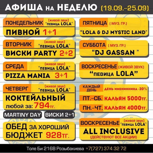 Сногшибательная Lola. До встречи в пабе Наш адрес: ул. Толе би 216 В, уг. ул. Розыбакиева. Тел.: 374-32-72.