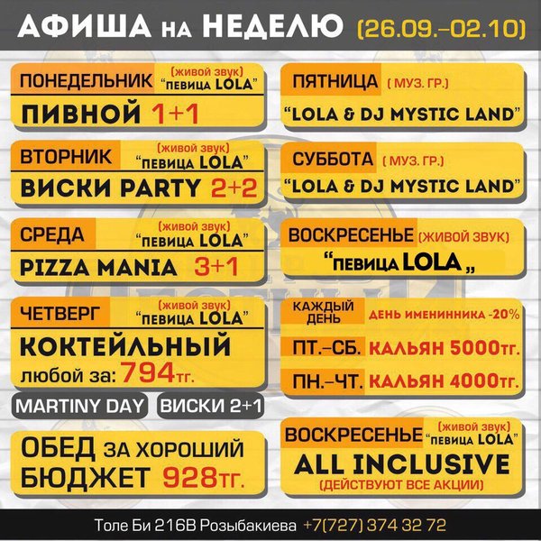 В нашем меню вкусные, легкие, сытные, аппетитные блюда на любой вкус и по доступной цене А после ужина вы можете насладиться восхитительными и ароматными кальянами До встречи в пабе Наш адрес: ул. Толе би 216 В, уг. ул. Розыбакиева. Тел.: 374-32-72.