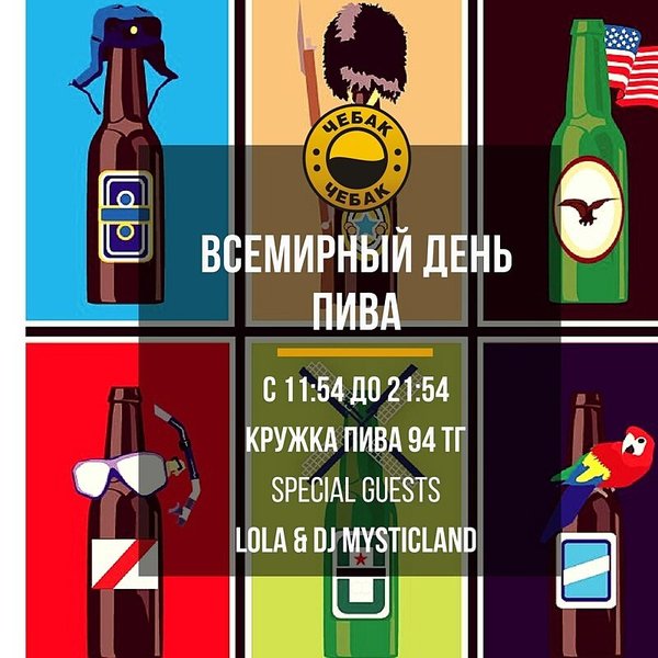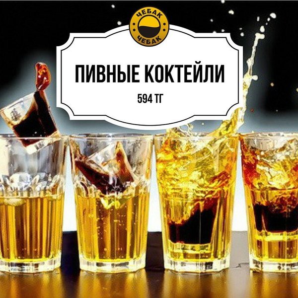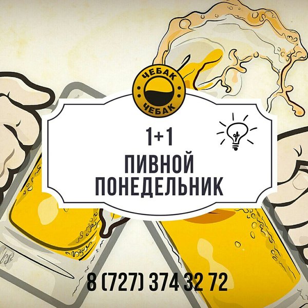 Приходя в Чебак на пару кружек пивка, выберите подходящую компанию для распития пенного напитка. Ведь выпив, важно, чтобы настроение повысилось не только от «градусов», но и от теплых дружеских бесед Акция понедельника — каждая вторая кружка пива за счёт заведения Чебак это клево Наш адрес: ул. Толе би 216 В, уг. ул. Розыбакиева. Резерв столиков: 374-32-72.