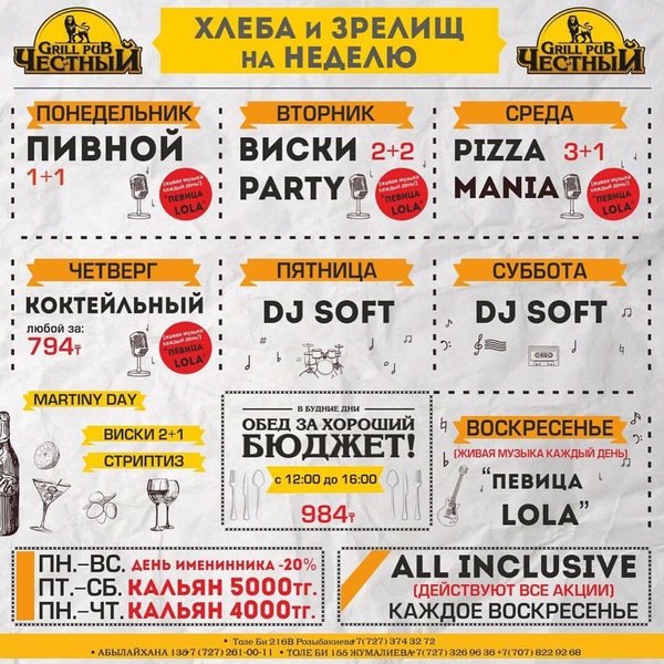 Добрый вечер, друзья! Желаем Вам вкусной и сытной недели вместе с Честным! Приятная музыка, уютная атмосфера и вкусная еда, что еще нужно для того что бы собраться в хорошей компании и поболтать по душам, а может быть и порешать важные дела, решать вам! В ЧЕСТНОМ обед за хороший бюджет 346 86 98 / WhatsApp ул.им.Толе би 155 А, уг.ул.Жумалиева БЦ » GRAND ASIA » 261 00 11 ул.Абылай Хана 135, уг.ул.Шевченко 374 32 72 ул.им.Толе би 216 B, уг.ул. Розыбакиева topche.info@gmail.com YouTube : Территория Объединенных Пабов