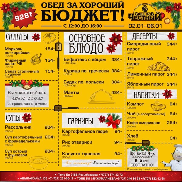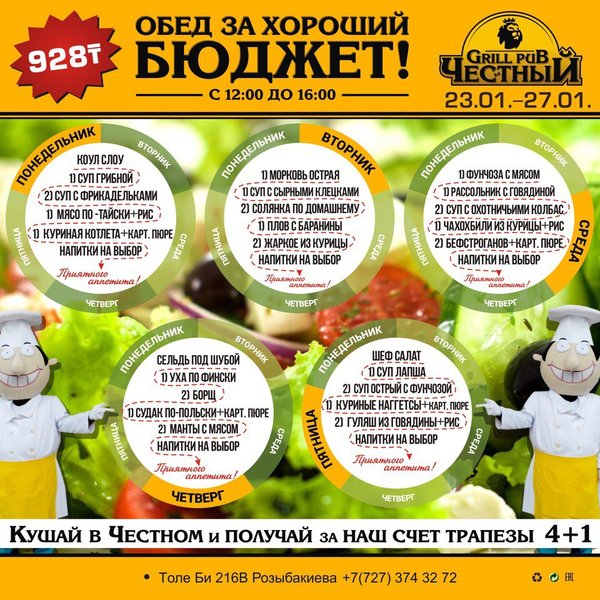 Добрый день, друзья! Желаем Вам вкусной и сытной недели вместе с Честным! В ЧЕСТНОМ обед за хороший бюджет 326 96 36 / WhatsApp ул.им.Толе би 155 А, уг.ул.Жумалиева БЦ » GRAND ASIA » 261 00 11 ул.Абылай Хана 135, уг.ул.Шевченко 374 32 72 ул.им.Толе би 216 B, уг.ул. Розыбакиева topche.info@gmail.com YouTube : Территория Объединенных Пабов