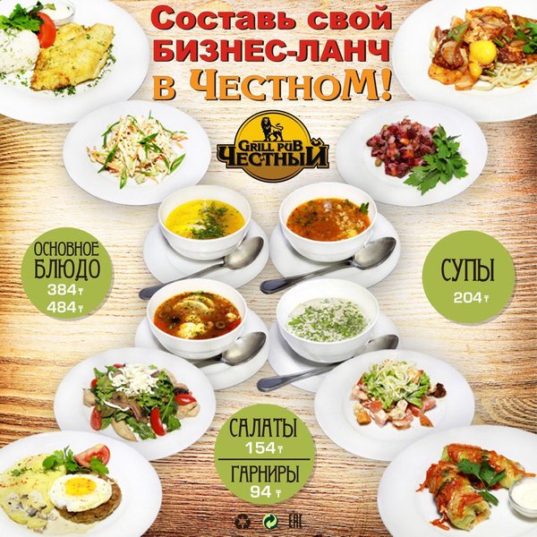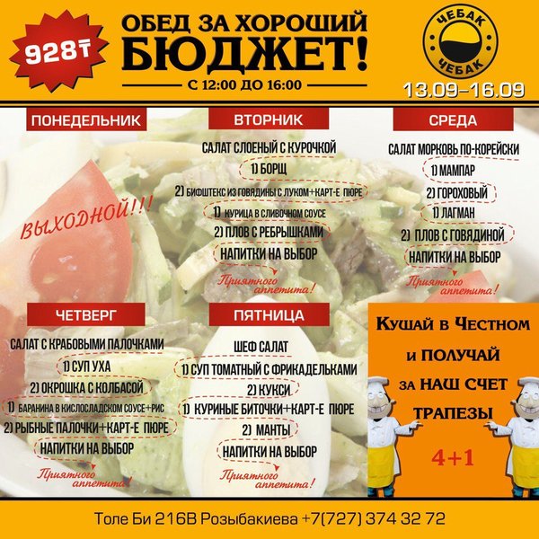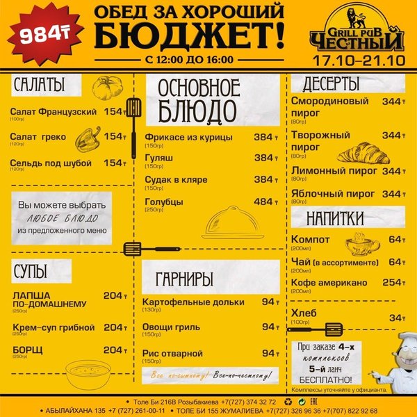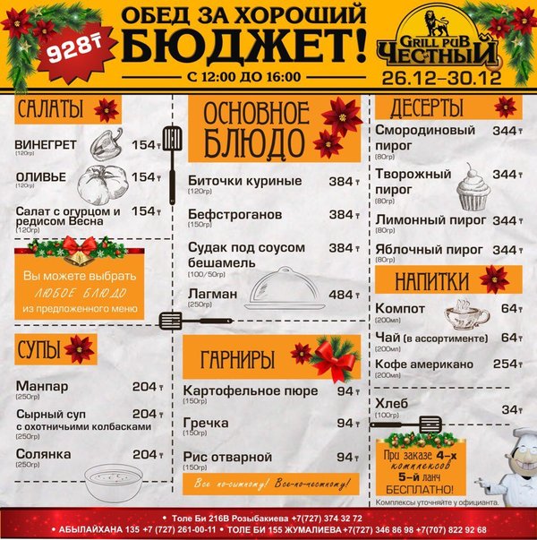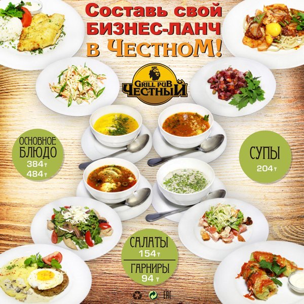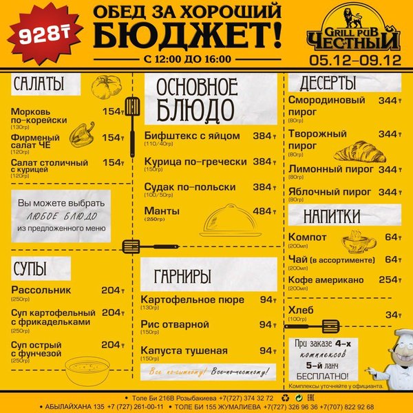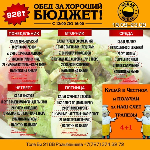 Составь свой бизнес — ланч в Честном Каждый будний день с 12:00 до 16:00 комплексный обед всего 928 тенге! Все по-сытному! Все по-честному! В ЧЕСТНОМ обед за хороший бюджет 374 32 72 ул.им.Толе би 216 B, уг.ул. Розыбакиева topche.info@gmail.com YouTube : Территория Объединенных Пабов