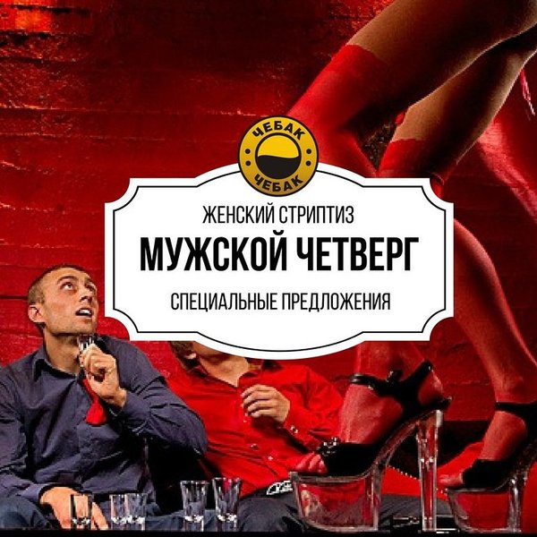 Чебак представляет Мужской Четверг! Пикантная вечеринка с самыми обольстительными и очаровательными девушками! Жаркое и незабываемое стрип-шоу для избранных ценителей женской красоты А также действуют специальные предложения: Jack Daniels 1л. = 6 594 тг. Мясной набор + Jack Daniels 1л. = 15 994 тг. Шашлычный набор + Jack Daniels 1л. = 15 994 тг. Музыкальная поддержка: Сногшибательная Lola. До встречи в пабе Наш адрес: ул. Толе би 216 В, уг. ул. Розыбакиева. Тел.: 374-32-72.