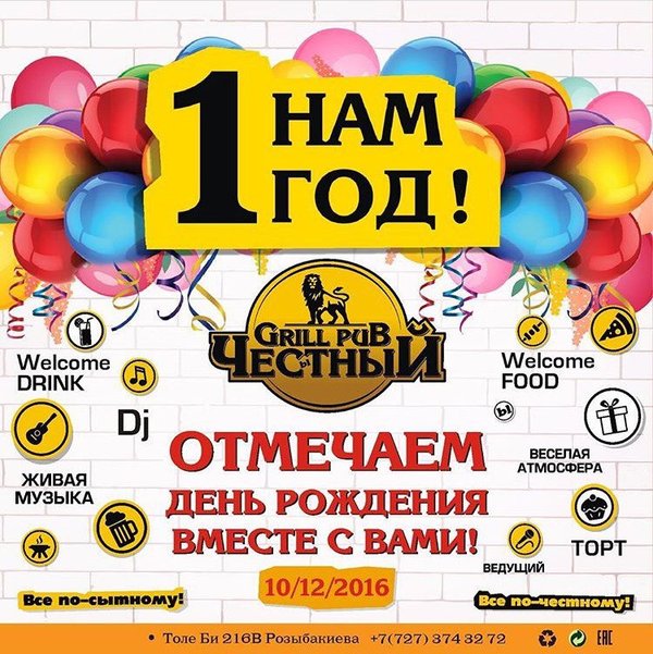 10 декабря Честный паб приглашает своих друзей на вечеринку по случаю своего первого дня рождения. Праздничное шоу, зажигательный дэнсинг, угощения и напитки гарантированы. Также в программе вечера: ведущий и живая музыка Резерв столов ️3743272 Толе Би 216 В, уг.ул.Розыбакиева