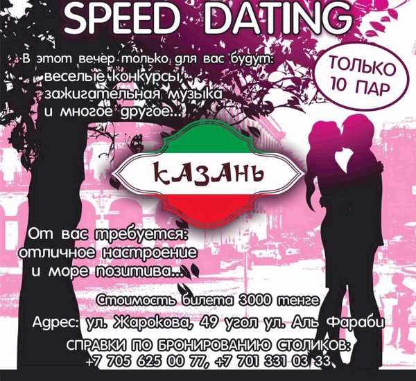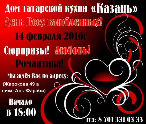 -Хочешь найти свою 2ю половинку среди участников? :) -найти новых друзей? -интересно провести время и пообщаться в необычной обстановке? Тогда тебе к нам! Не будь одинок(-а) на день Влюбленных — приходи на Татарча Speed Dating! 14 февраля в Доме татарской кухни «Казань». Цена счастья — 3000тг.