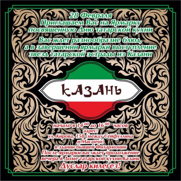 А знаете ли Вы, что 28 февраля — День татарской кухни?! В честь этого праздника, приглашаем Вас на ярмарку, отведать вкусную татарскую выпечку и блюда! А после ярмарки вас ждет продолжение вечера в Доме татарской кухни «Казань»!