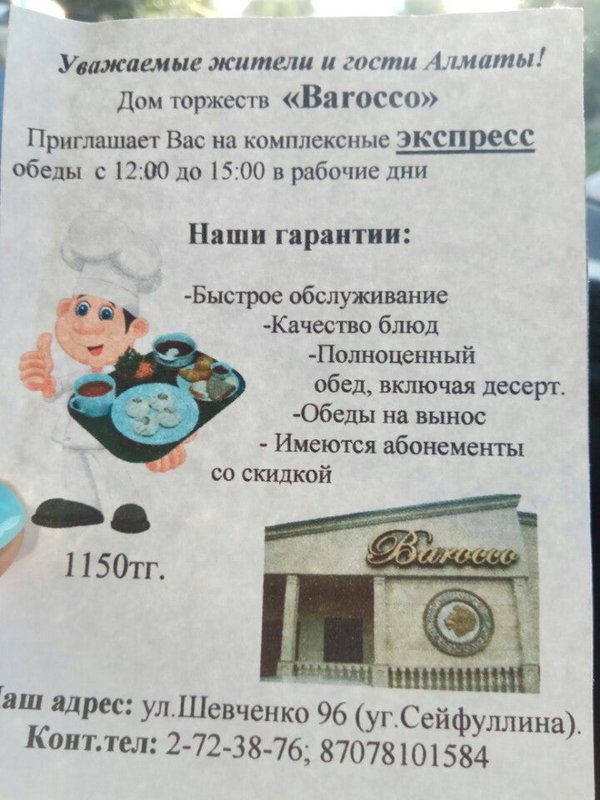 Зал торжеств «Barocco» находится в Алмалинском районе, на улице Шевченко. В меню заведения вы сможете найти разнообразие блюд казахской, восточной и европейской кухонь. Здесь имеется 4 зала, рассчитанные на 200, 120, 30 и 20 персон. Для посетителей открыт бесплатный доступ к Wi-Fi. У здания зала торжеств есть удобная парковка. С собой допустимо приносить на банкет алкогольные и безалкогольные напитки.