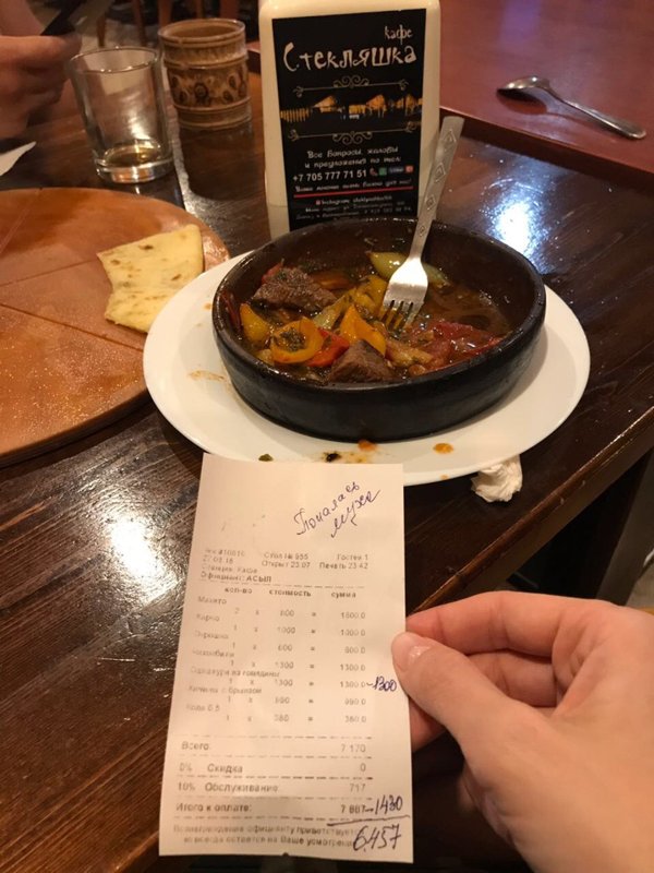 Мда уж, неквалифицированный персонал. В третий раз были и в таком шоке (Шашлык никакой, заказала черный чай, оф-ка принесла ташкентский за 750тг, я платить за него не стала, принесла перерасчёт. В прошлый раз также обсчитала. И лицо такое недовольное. Больше ни ногой в это заведение. Не умеете работать(