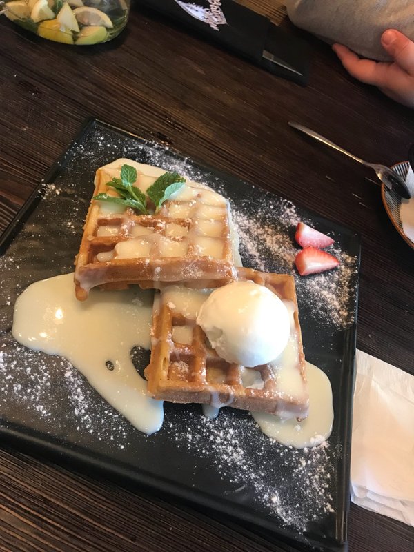 А еще эти вафли у них нереально вкусные ️вообще там должен быть джем, но мы попросили заменить на сгущенку и они пошли нам на встречу ️это очень приятно! Спасибо всему персоналу!