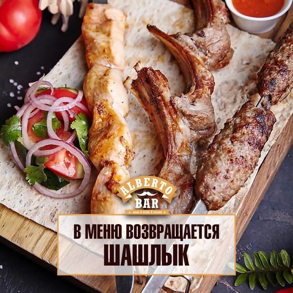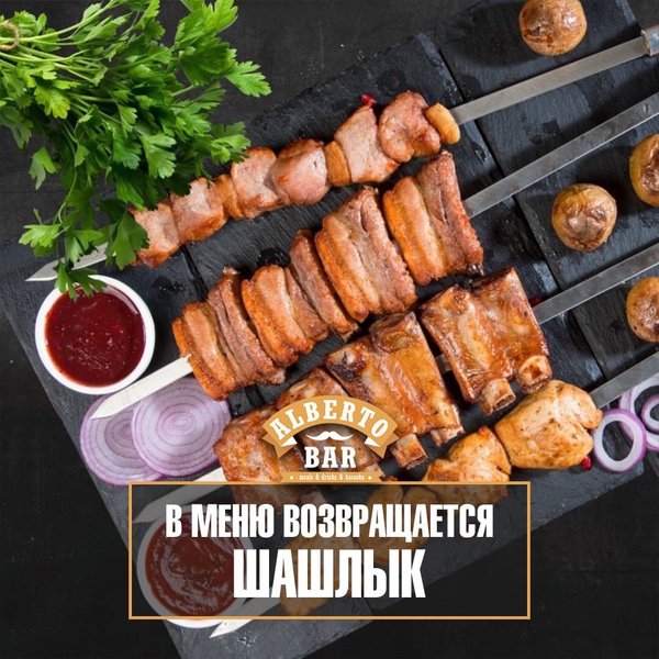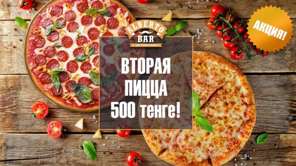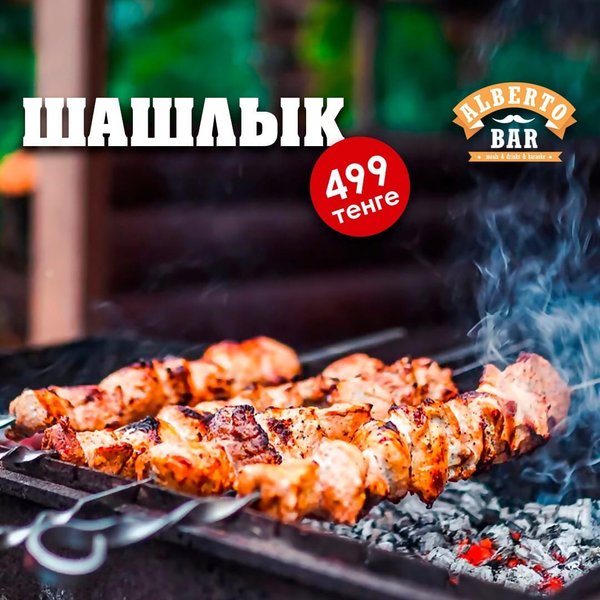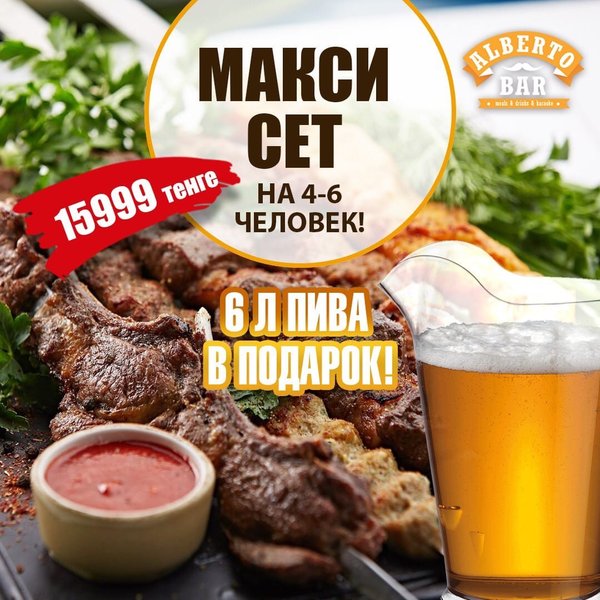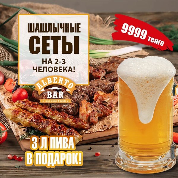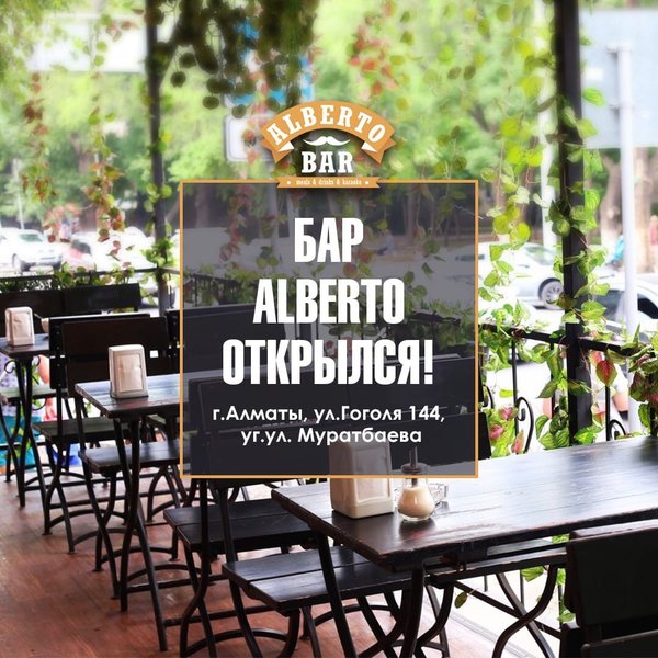 Alberto bar создан для тех, кто знает толк в настоящем отдыхе! Только у нас Вы найдёте настоящий, неповторимый вкус любимых блюд! Только здесь Вы сможете расслабиться и насладиться моментом «сейчас»! У нас действуют предложения для наших любимых гостей: Бизнес-ланч — 770 тенге; Шашлыки — от 660 тенге; Пиво — от 300 тенге; Вторая пицца Маргарита или Пепперони в подарок. Ждём всех! _________ ,