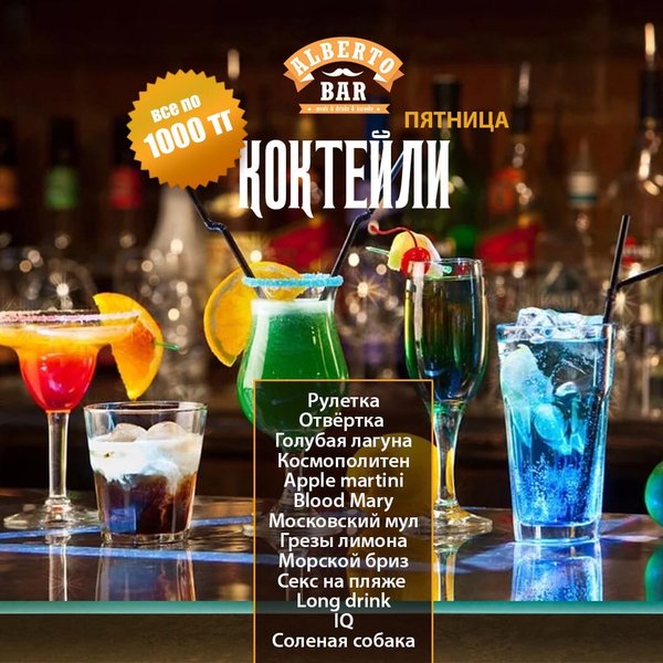 КАЖДУЮ ПЯТНИЦУ ДАННЫЕ КОКТЕЙЛИ ПО 1000 тенге Самое время отметить эту прекрасную акцию каким-нибудь из представленных напитков Зови друзей, мы ждём только Вас _________ ,