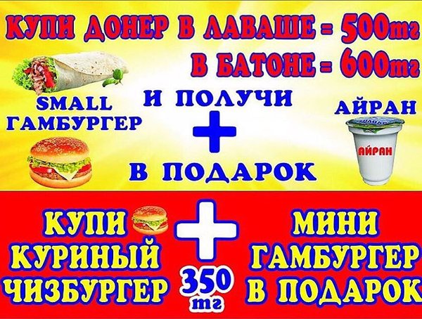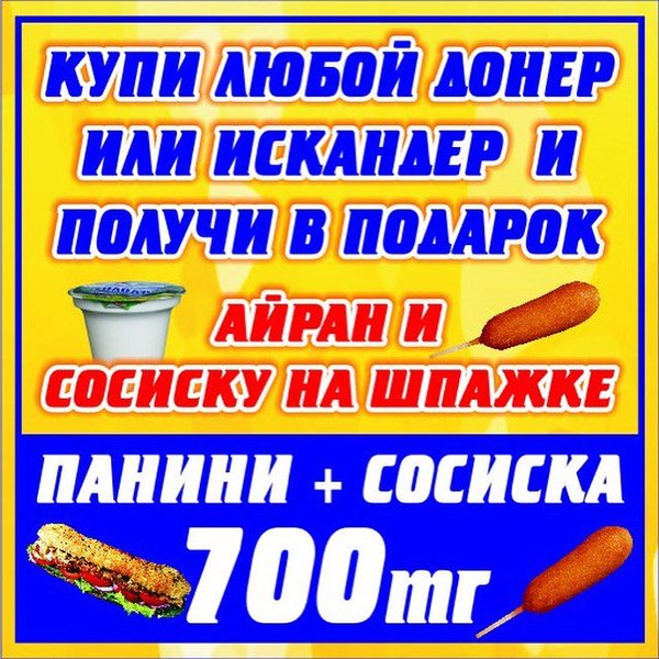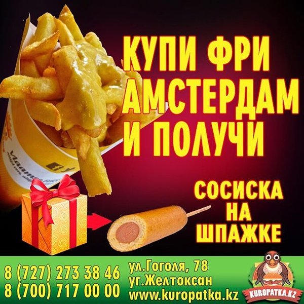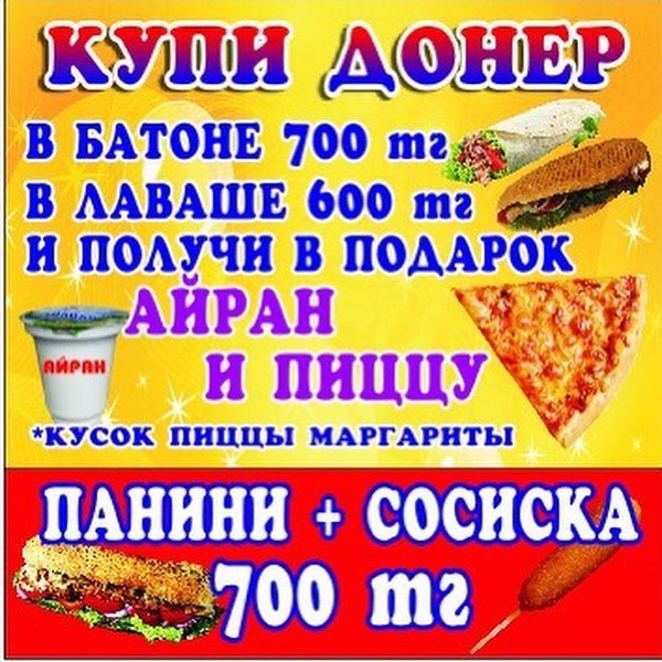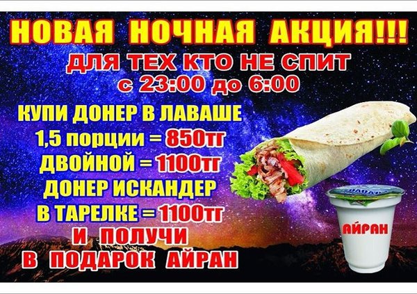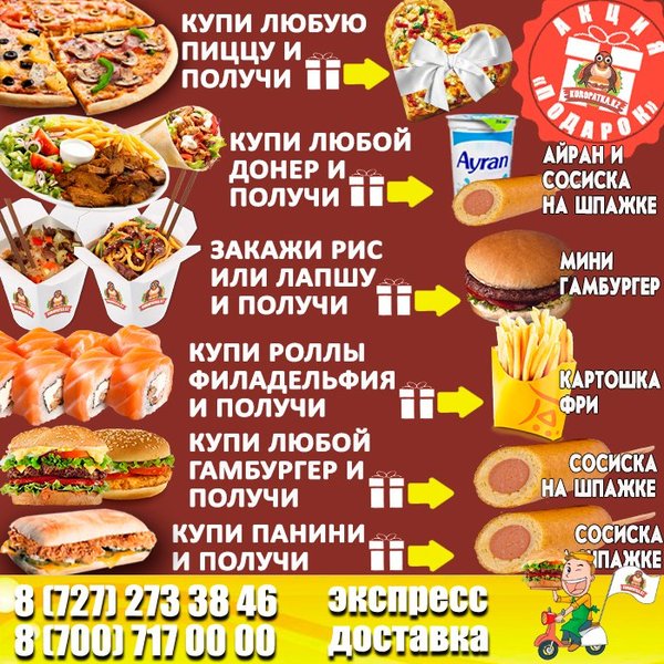 Новая акция на фаст фуде — Купи любой донер или искандер и получи в подарок Айран К любой пицце — пицца Сердечко в подарок. К любой лапше или рису — сосиска на шпажке. К панини — сосиска на шпажке К фри Амстердам -сосиска на шпажке. Работаем круглосуточно! Данная акция действует при доставке и на вынос.