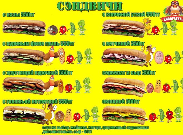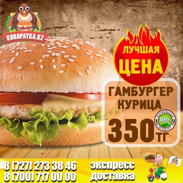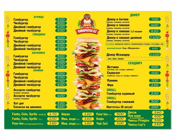 оценить вкус настоящего гамбургера. Вас ждет настоящая американская кухня — гамбургеры из 100% говядины, картофель фри и многое другое. А теперь и новинка: Панини специально для Вас за 600 тг! Пицца от 900 тг. Гамбургеры от 300 тг. Хот Дог 300 тг. Сэндвичи от 300 тг. Сосиска на шпажке — 200 тг.. Фри — 250 тг! Донер в батоне 600 тг и в лаваше 500 тг. Отличная команда, высокая скорость обслуживания и, конечно же, непревзойденное качество — всё это Фаст Фуд Дональдс/Kuropatka!