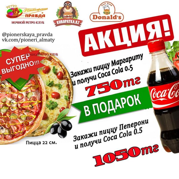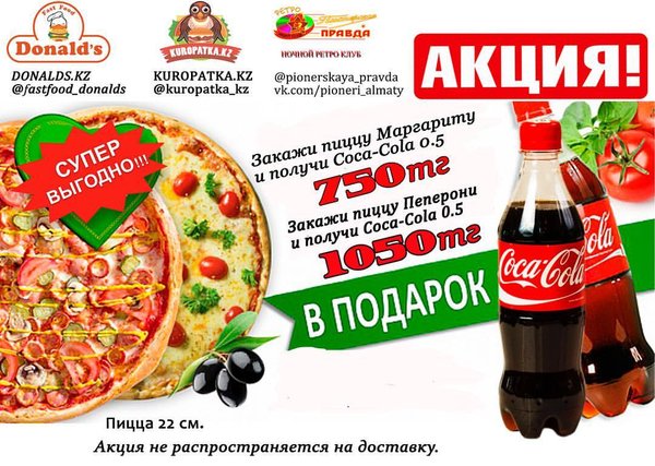 Фастфуд Дональдс (04.05.2017): Акция ️! Пицца Маргарита + кола 0.5 за 750 тг! Пицца Пеперони + кола 0.5 за 1050 тг! Круглосуточно- @kuropatka_kz и @fastfood_donalds. С 20.00 до 00.00(кроме пятницы и субботы) — @pionerskaya_pravda Время акции ограничено и не действует при доставке.