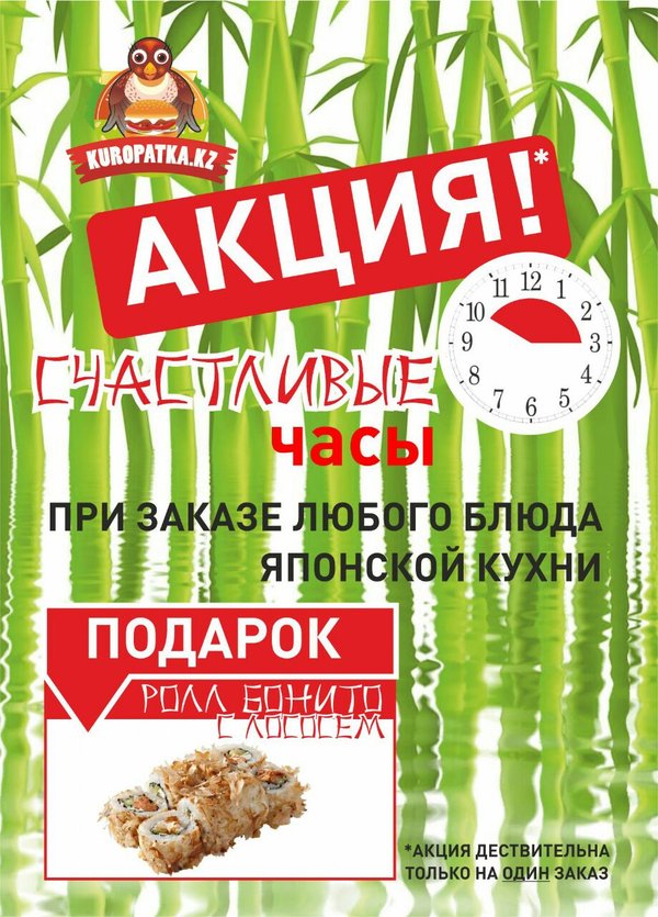 Новая акция на фаст фуде и Работаем круглосуточно! Данная акция не действует при доставке, только на вынос. Доставка суши, роллов, пиццы, донеров, гамбургеров в Алматы. На вынос работаем круглосуточно. Доставка суши и роллов в Алматы из нового магазина Суши- Куропатка с быстрой, бесплатной доставкой(в квадрате) по Алматы предлагает вам заказать из меню разнообразные, вкусные суши и роллы на доставку и на вынос. В нашем магазине Вы всегда можете купить или заказать вкусные, свежие суши, роллы и китайскую вок лапшу в коробочке по доступным ценам… — Читать дальше