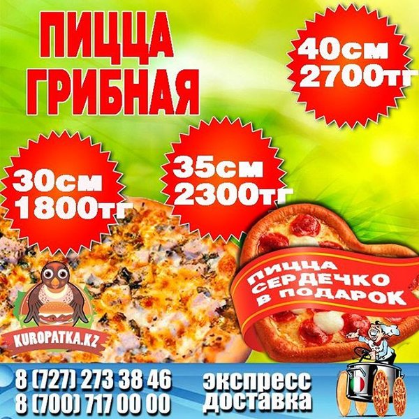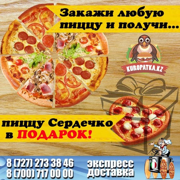 Бесплатный Алматы (03.02.2016): Kuropatka.kz подарит 5 наборов роллов Филадельфия и 5 пицц Маргарита, десятерым нашим случайным подписчикам, сделавшим репост этой записи и вступившему в группу. Победитель будет определен 17 февраля.
