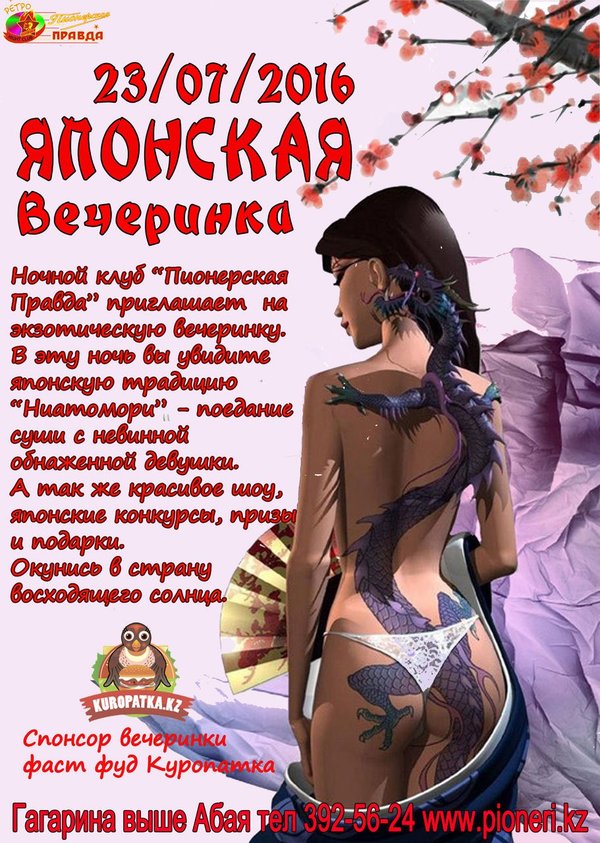 Ночной ретро клуб «Пионерская Правда» (12.07.2016): 23 июля 2016 «Японская вечеринка- Ниатомори» Ночной клуб «Пионерская Правда» приглашает на экзотическую вечеринку. В эту ночь вы увидите японскую традицию «Ниатомори» — поедание суши с невинной обнаженной девушки. А так же красивое шоу, японские конкурсы, призы и подарки. Окунись в страну восходящего солнца. Спонсор вечеринки фаст фуд Куропатка » доставка суши и пиццы в Алматы.