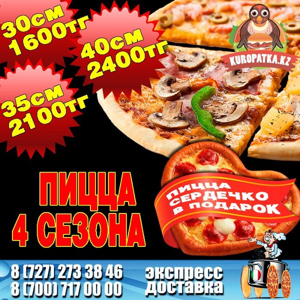 Фастфуд Дональдс (07.07.2017): Новинка! Пицца Хит Продаж ️ 4 вида пиццы в одной пицце- Куриная Маргарита Пепперони Мексикано В подарок пицца — сердечко! Ждём ваших заказов! ️ ️ ️ @ Алматы