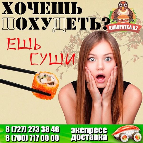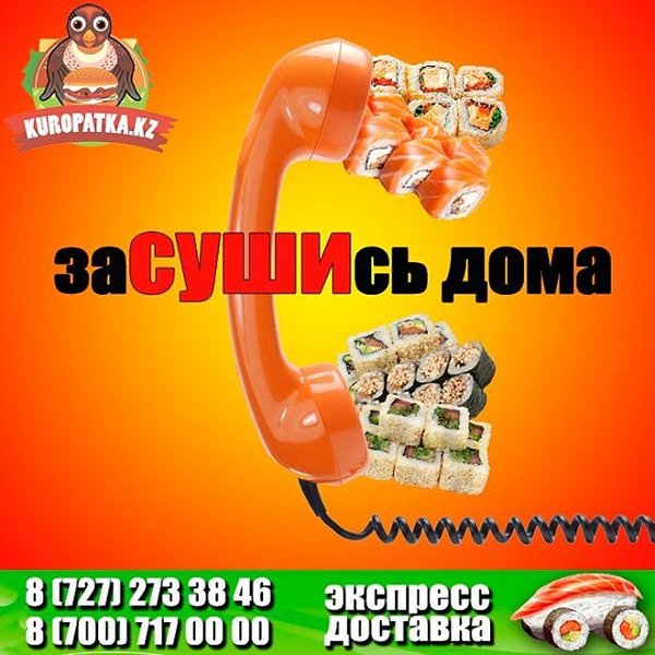 Доставка суши, роллов, пиццы, донеров, гамбургеров в Алматы. На вынос работаем круглосуточно. Доставка суши и роллов в Алматы из нового магазина Суши- Куропатка с быстрой, бесплатной доставкой(в квадрате) по Алматы предлагает вам заказать из меню разнообразные, вкусные суши и роллы на доставку и на вынос. В нашем магазине Вы всегда можете купить или заказать вкусные, свежие суши, роллы и китайскую вок лапшу в коробочке по доступным ценам, а также заказать доставку на дом или в офис. Все цены на нашем сайте