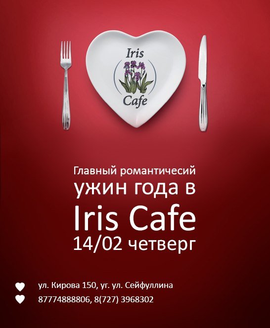 Проведите самый романтический ужин года в Iris Cafe! Вас ждет праздничная атмосфера, а главным творческим наполнением станет выступление Дивы! Всех гостей ждет сладкий комплимент!