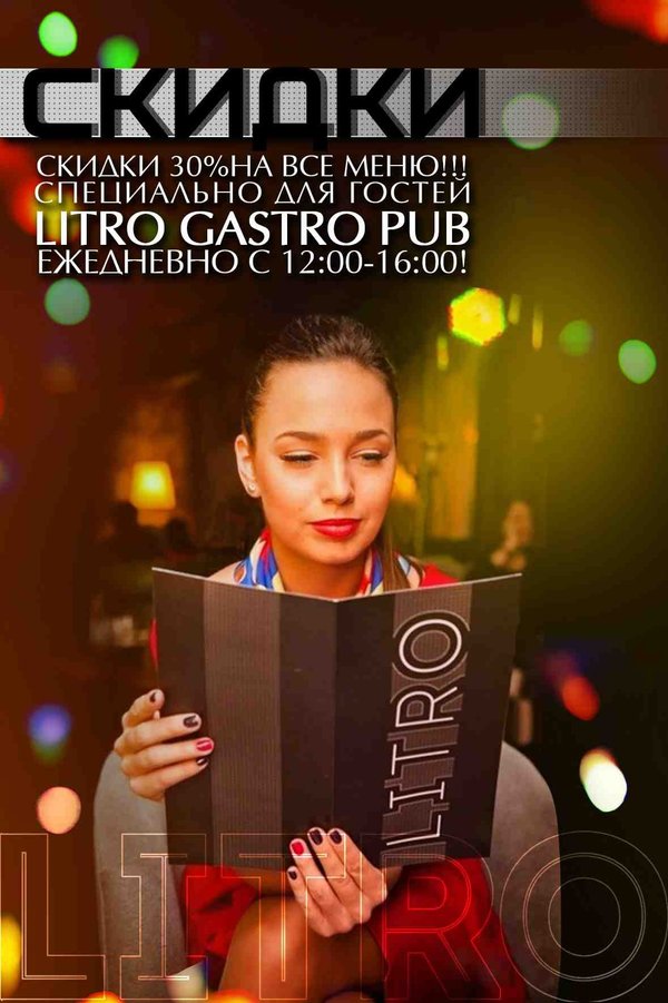 DELETED (15.01.2013): Двери Gastro pub LITRO открыты каждый день для наших старых и новых друзей. Мы работаем ежедневно с 12—00 до 01—00 по будням и с 12—00 до 03—00 по выходным и праздникам. Днем Вы можете провести деловые встречи и просто вкусно пообедать. Для Вас мы ввели 30% скидки на все блюда нашей изысканной кухни. Скидка действует каждый будний день с 12—00 до 16—00. Искренне Ваш, LITRO.