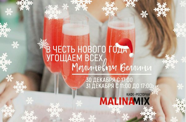 Друзья, праздник совсем рядом и чтобы последние дни уходящего года остались в памяти теплыми, светлыми и приятными сегодня весь вечер с 17:00 и завтра весь день до 17:00 Малина MIX угощает всех всех всех Малиновым Беллини на основе искрящегося игристого вина, рома и малинового сиропа или Малиновым лимонадом на выбор. С наступающим Новым Годом! С любовью, Малина MIX!