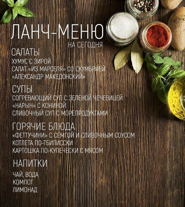 Меню ланча на 28.12.2016 г. с 12:00 до 15:00. Стоимость 1500 тг. + 10% (обслуживание) Наш адрес: г. Алматы, ул. Габдуллина 72 уг. ул. Байзакова Телефон для справок: 394 72 09