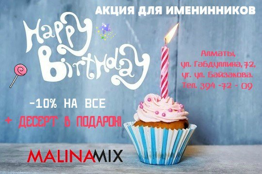 Три дня до дня рождения, день рождения и три дня после дня рождения (итого 7 дней) в ресторане действует скидка -10% на все меню и один десерт имениннику в подарок! Условия: гостю необходимо при себе иметь удостоверение личности или паспорт для предоставления персоналу по требованию для получения подарков.