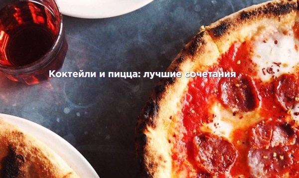 з виски и вермута с горьковатым вкусом отлично сочетается с кислым томатным соусом и солёным сыром. «Маргарита» + Негрони Обычная «Маргарита» – это пицца, которая делается исключительно по итальянскому рецепту. Начинка из свежей моцареллы, базилика и томатов соединяются с другим ультра-итальянским трёхсоставным шедевром – коктейлем «Негрони». Эта парочка создана друг для друга. Пицца с пепперони + Куба Либре Нет лучшего момента в детстве, чем большой кусок пиццы и стакана кока-колы. Вновь почувствовать эти ностальгические ароматы позволит сочетание острых колбасок и коктейля «Куба Либре». Сладость колы уравновешивает пепперони, а сок лайма помогает расщеплять жир. Острая куриная пицца + Кровавая Мэри Пицца с курицей и «Кровавая Мэри» – это идеальные партнёры. Выбрав это сочетание, вы можете наслаждаться им не только в ресторане, но и у себя дома, так как рецепт коктейля довольно прост в приготовлении. Пряный острый соус и густой томатный сок замечательно дополняют вкус пиццы. Грибная пицца + Нью-Йорк Сауэр Грибы и красное вино – это брак, заключённый на небесах. Поэтому коктейль на основе красного вина будет обязательным к пицце с грибами. Смесь виски/бурбона и вина противопоставляется грубоватому вкусу грибов (особенно, если в напитке используется темпранильо) Нью-Йорк Сауэр станет настоящей половинкой для пиццы.