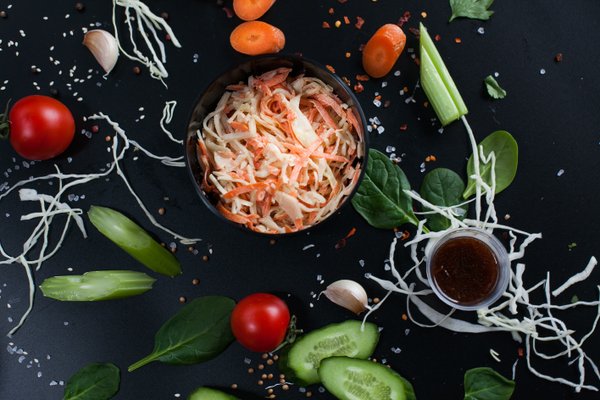 Очень лёгкий и исключительно полезный «Азиатский» салат из свежих овощей и зелени Отлично сочетается с оригинальной кисло-сладо-острой заправкой на основе соевого соуса и кунжутного масла. Закажем?