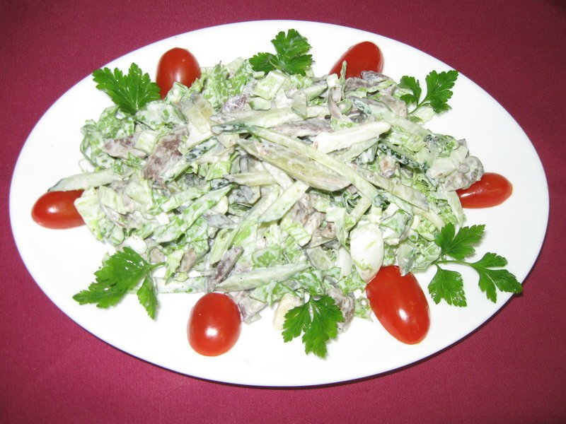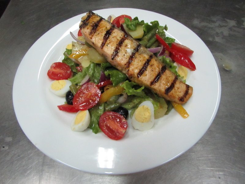 Салат с овощами отварным картофелем, перепелиными яйцами, горчичной заправкой и нежным стейком из семги...