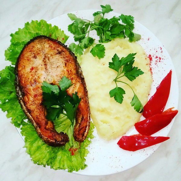 Стэйк из семги с картофельным пюре (семга, пюре картофельное, острый перчик, зелень) 330 гр — 2000 тг