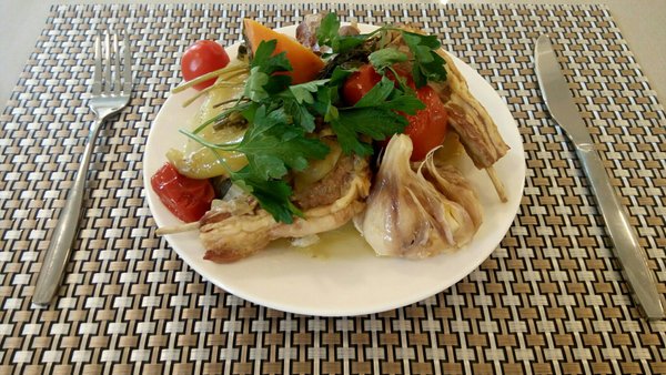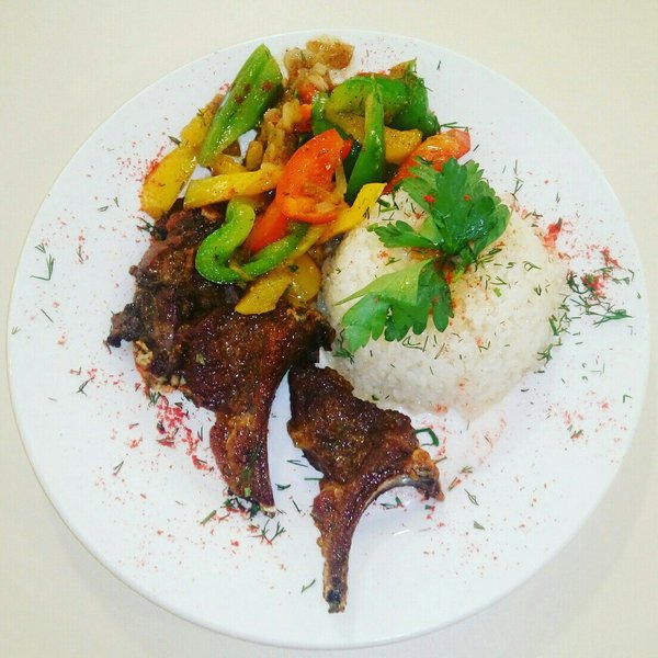 Бараньи рёбрышки с овощами и рисом (баранина, овощи, рис, специи) 550 гр — 1150 тг