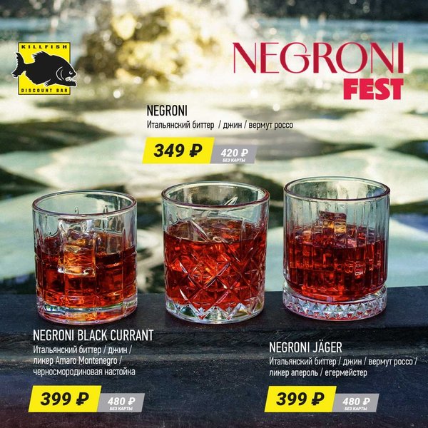 NEGRONI FEST в KILLFISH! С 22 по 28 сентября в рамках всемирной Недели Негрони мы представляем новые версии легендарного напитка! Приходи и попробуй классический Негрони или наши авторские вариации — Negroni Black Currant и Negroni Jäger! Подробнее:
