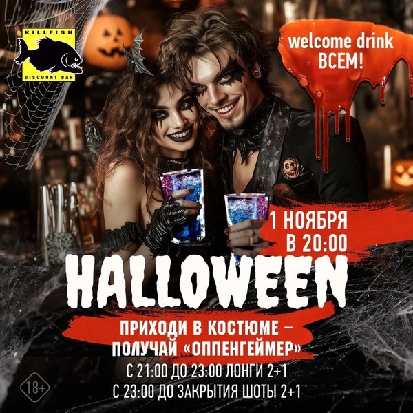 А еще лови жутко вкусные акции: коктейль «Кровавая Мэри» за 199 руб. шот «Укус вампира» 2+1 ️31 октября встречаемся в барах KILLFISH: