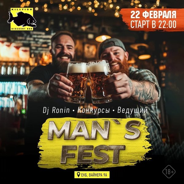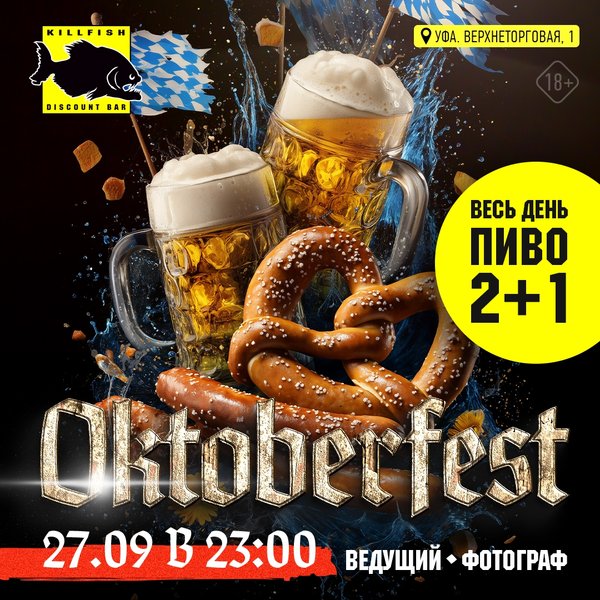 Уфа, готовься к мощному хмельному фестивалю в KILLFISH! 27.09 вечеринка Октоберфест в любимом баре! ️ Тебя ждет незабываемая атмосфера баварского веселья, ведущий и фотограф! Весь день пиво будет литься рекой — все разливное по акции 2+1! Бери друзей и приходи на Верхнеторговую пл.1! Начинаем фестивалить в 23:00.