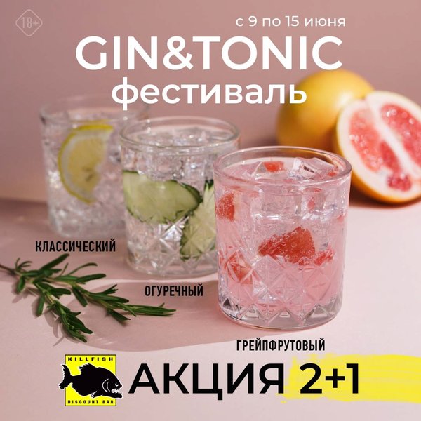 С 9 по 15 июня коктейли джин-тоник по акции 2+1 всю неделю без ограничений: — любимый классический