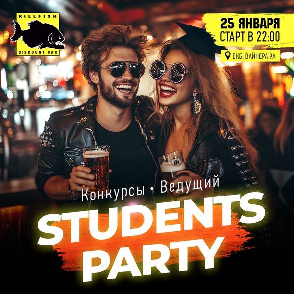 Приходи на грандиозную студенческую вечеринку в KILLFISH BAR! Отпразднуем День Студента и Татьянин день за один заход! Посещение вечеринки гарантирует сдачу всех зачетов! Уже в эту субботу мы подготовили для тебя интересные конкурсы и умопомрачительную программу от ведущего. Приходи за яркими впечатлениями и эмоциями! Ждем тебя и твоих друзей на Вайнера, 9А в 22:00! ️