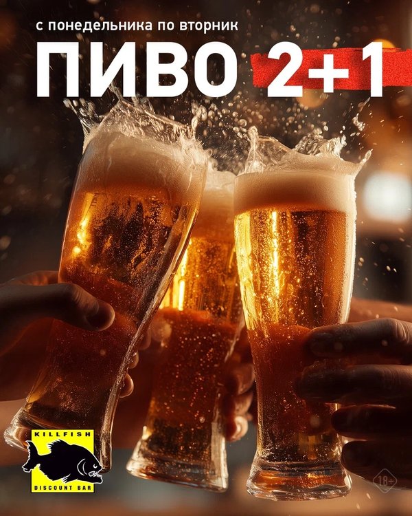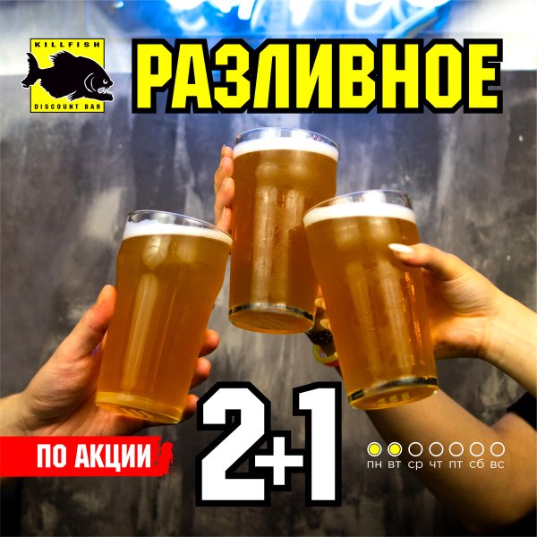 Понедельник и вторник — Дни пива в KILLFISH! Акция 2+1 на разливное пенное в барах по адресам: Москва, ул.Покровка 10 Москва, ул.Арбат 22 Москва, ул.Новослободская 20 Екатеринбург, ул.Ленина 46 Скидка 20% на литровый бокал пива в барах по адресам: Санкт-Петербург, ул.Восстания 30 Санкт-Петербург, пр.Загородный 32 Санкт-Петербург, ул.Садовая 45 Екатеринбург, ул.Вайнера 9а