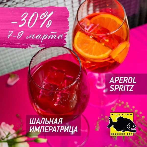 В честь праздника дарим всем скидку 30% на коктейли Aperol Spritz и Шальная императрица