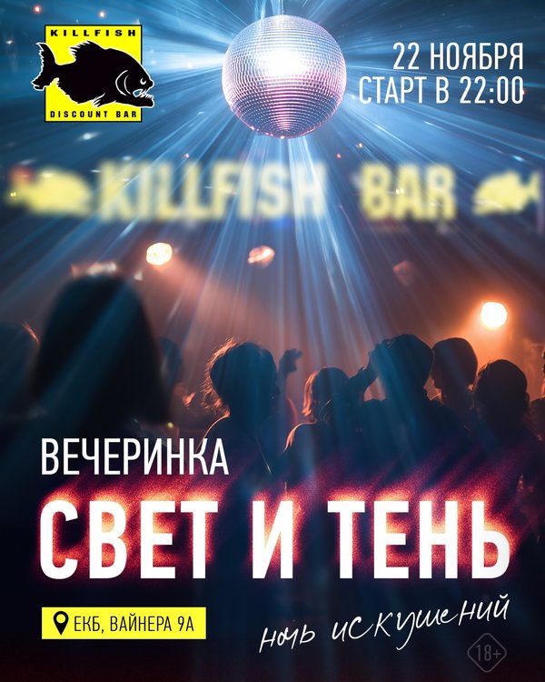 Екатеринбург! 22 ноября ждем тебя на ночь искушений — вечеринку «Свет и тень» в KILLFISH! Погрузись в атмосферу загадок и контрастов — свет против тени, ритмы против тишины! Зажигательные сеты от диджея, ведущий и приятная атмосфера для незабываемых впечатлений! Не пропусти! Старт в 22:00 Адрес: г. Екатеринбург, ул. Вайнера, 9а.