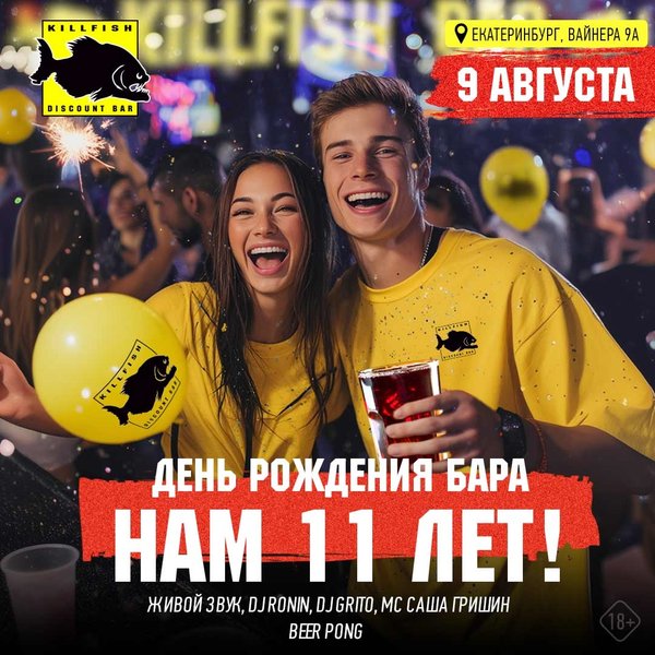 Екатеринбург! 9 августа тебя ждет самая жаркая тусовка лета на Вайнера 9а! Будем зажигать на Дне Рождения любимого бара! Нам 11 лет! Мастер-класс по приготовлению коктейлей с 18:00 до 20:00 Beer pong с 20:00 до 22:00 Лотерея Яркий ведущий вечеринки Саша Гришин Живой звук и горячие сеты от DJ Ronin и DJ Grito Ты готов к безбашенному отрыву? Старт: с 16:00 Екатеринбург, бар KILLFISH, ул. Вайнера, д. 9а.