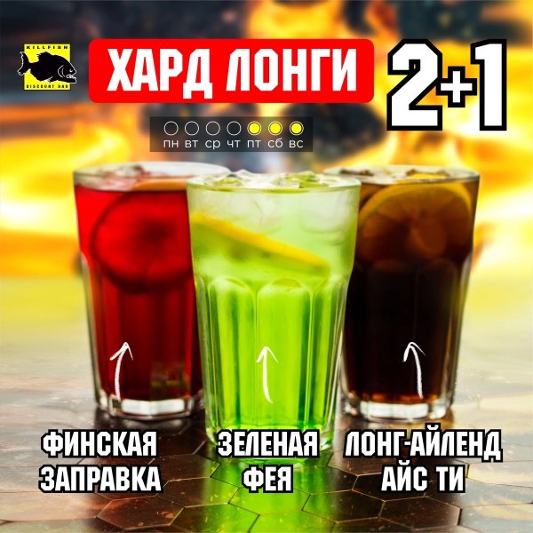Зимний патихард в KILLFISH! Каждую среду и четверг 3 любых хард лонга за 1111 рублей! Выбирай три любимых коктейля: • Финская заправка • Лонг Айленд Айс Ти • Зеленая фея • Оппенгеймер • Красная тревога и наслаждайся без ограничений! Подробнее: