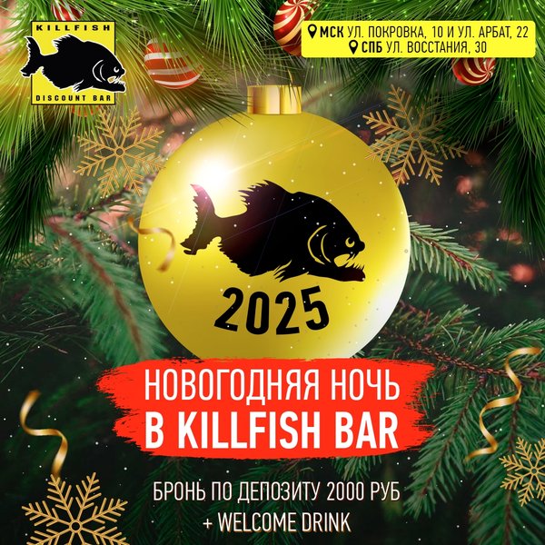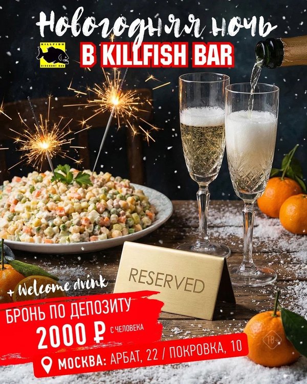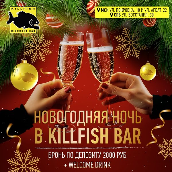 Москва, отпразднуй Новый 2026 год в KILLFISH! 31 декабря приглашаем всех на незабываемую новогоднюю вечеринку! Атмосфера любимого бара, друзья, море алкоголя и лучшая дискотека года! Welcome-drink каждому гостю на выбор: бокал лагера, коктейль Виски-кола или Кир-рояль Бронирование по депозиту 2000 рублей с человека Вход без брони 1000 рублей Адреса баров, работающих в новогоднюю ночь: Москва, ул. Арбат, 22 Москва, ул. Покровка, 10 ️ Веселимся с 20:00 до 05:00 — не пропусти ни минуты!