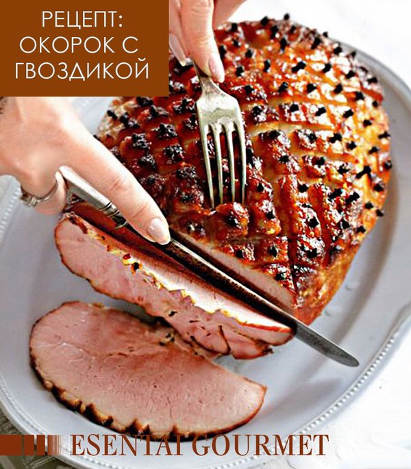 листом в большую кастрюлю, залейте свежей кипящей водой и на сильном огне доведите до кипения. Уменьшите огонь, приправьте перцем, неплотно накройте крышкой и оставьте вариться на 5 ч. 3. Переложите окорок на противень (овощи больше не понадобятся). Дайте немного остыть, срежьте кожу с тонким слоем подкожного жира. 4. Сделайте на верхнем слое оставшегося жира диагональные надрезы в виде сеточки. В каждую ячейку вставьте по 1 бутону гвоздики. Смешайте джем с коньяком и обильно смажьте этой смесью верх окорока. Запекайте 1 ч в разогретой до 180 С духовке. Приятного аппетита от Esentai Gourmet!