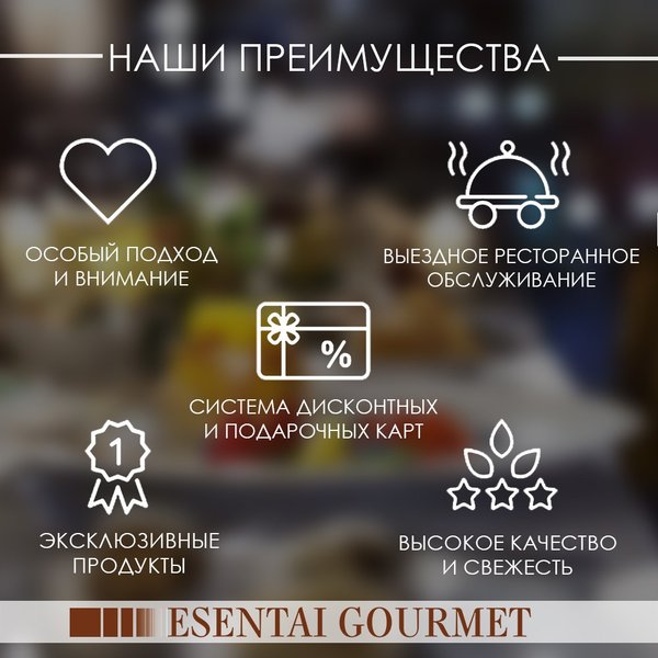 Наши преимущества! Esentai Gourmet это принципиально новый подход к формированию собственного меню из высококачественных продуктов и деликатесов со всего мира. Предлагаемый ассортимент гастронома способен удовлетворить потребности самых взыскательных и искушенных ценителей еды. Всего представлено более 5 000 наименований товара, 2 000 из которых являются эксклюзивными продуктами, которые можно найти только в Esentai Gourmet. Вы достойны лучшего. Добро пожаловать в Esentai Gourmet!
