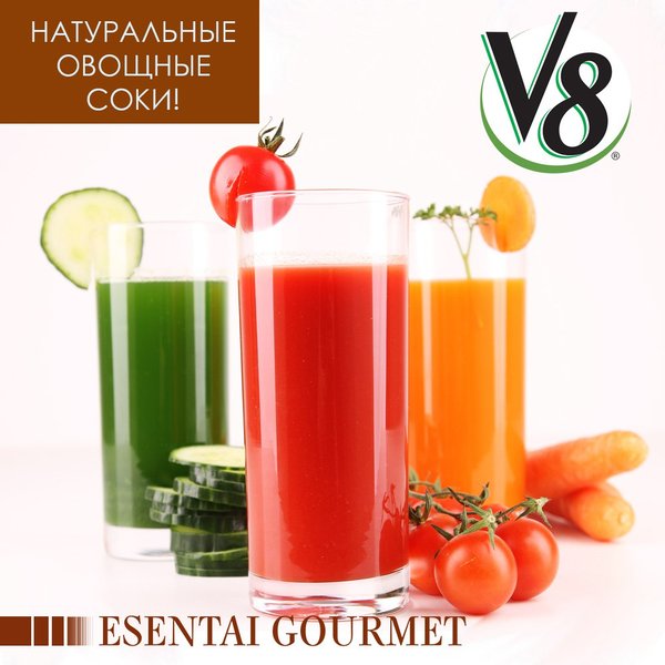V8 вкуснейшие овощные соки. Сок из овощей под брендом V8 содержит в себе смесь из трех овощей, что обеспечивает низкую калорийность, а отсутствие подсластителей и ароматизаторов не оказывает вредного воздействия на организм. Они корректируют кислотно-щелочное равновесие в крови, способствуют выведению из организма токсинов, стимулируют пищеварение и очень быстро усваиваются буквально через час после употребления. Витаминов, минеральных солей и полезных микроэлементов в овощных соках намного больше, чем во фруктовых и ягодных.