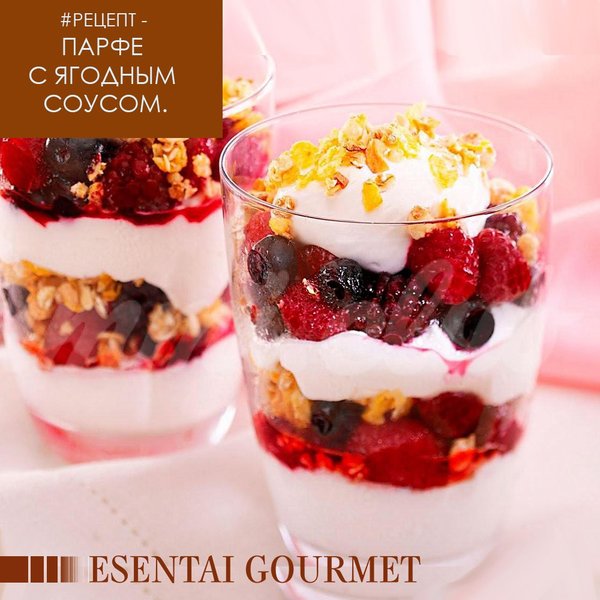 Американское парфе с ягодным соусом. ИНГРЕДИЕНТЫ: ягоды (малина, черника, клубника) — 300 г сахар — 50 г ванильный сахар — 1 ч.л греческий йогурт — 600 г гранола — 350 г ягоды для украшения СПОСОБ ПРИГОТОВЛЕНИЯ: Шаг 1 Готовим соус: В кастрюле смешать ягоды, сахар и ванильный сахар. Довести до кипения и тушить 5—10 минут, пока ягоды не дадут сок. С помощью блендера измельчить ягоды в пюре. Остудить. Шаг 2 Выложить в стаканы слоями: йогурт, ягодный соус, гранола, йогурт, еще немного ягодного соуса и свежие ягоды.